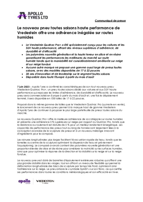 Apollo Tyres a confirmé les caractéristiques de son tout nouveau pneu Vredestein Quatrac Pro+, un pneu toutes saisons dédié aux voitures et aux SUV haute performance qui repousse les limites d'adhérence, de durabilité et d'efficacité. Le nouveau pneu sera commercialisé en Europe à partir du mois d'août et, une fois le déploiement terminé, il sera disponible en 108 tailles de 17 à 22 pouces.