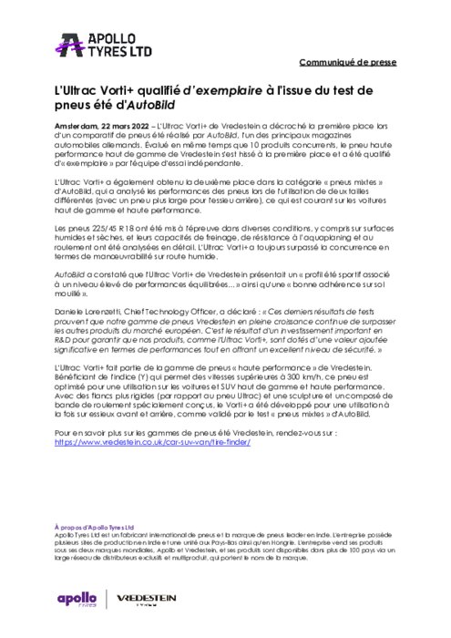 L'Ultrac Vorti+ de Vredestein a décroché la première place lors d'un comparatif de pneus été réalisé par AutoBild, l'un des principaux magazines automobiles allemands. Évalué en même temps que 10 produits concurrents, le pneu haute performance haut de gamme de Vredestein s'est hissé à la première place et a été qualifié d'« exemplaire » par l'équipe d'essai indépendante.