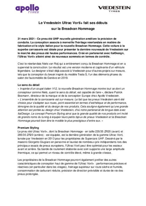 Ce pneu été UHP nouvelle génération améliore la précision de conduite. La conception associe à merveille l'héritage néerlandais en matière de fabrication et le style italien pour la nouvelle Breadvan Hommage. Cette voiture à la superbe carrosserie est idéale pour présenter la dernière nouveauté de Vredestein sur le marché des pneus été hautes performances. Créé en partenariat avec ItalDesign, l'Ultrac Vorti+ atteint ainsi de nouveaux sommets en termes de contrôle.