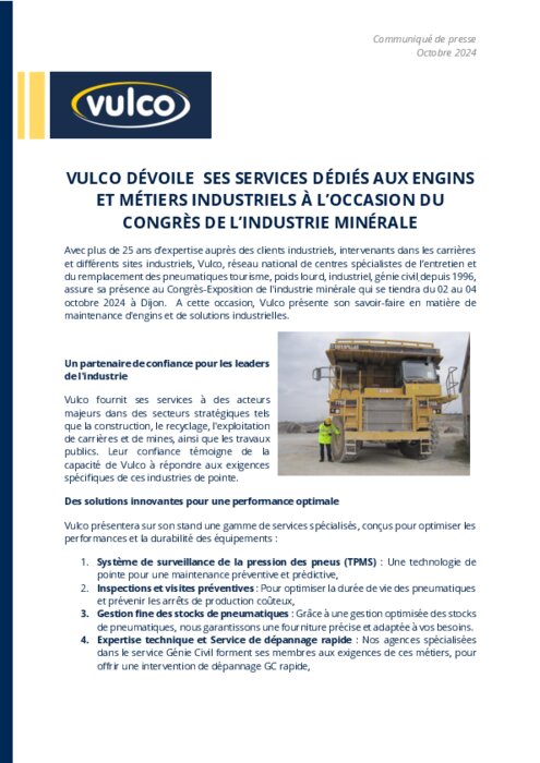 Avec plus de 25 ans d’expertise auprès des clients industriels, intervenants dans les carrières et différents sites industriels, Vulco, réseau national de centres spécialistes de l’entretien et du remplacement des pneumatiques tourisme, poids lourd, industriel, génie civil depuis 1996, assure sa présence au Congrès-Exposition de l'industrie minérale qui se tiendra du 02 au 04 octobre 2024 à Dijon. A cette occasion, Vulco présente son savoir-faire en matière de maintenance d'engins et de solutions industrielles.