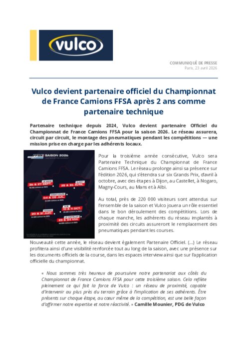 Partenaire technique depuis 2024, Vulco devient partenaire Officiel du Championnat de France Camions FFSA pour la saison 2026. Le réseau assurera, circuit par circuit, le montage des pneumatiques pendant les compétitions — une mission prise en charge par les adhérents locaux.