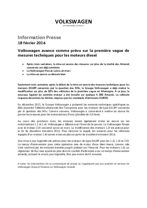 Seulement trois semaines après le début de la mise en œuvre des mesures techniques pour les moteurs EA189 concernés par la question des NOx, le Groupe Volkswagen a déjà réalisé la modification sur plus de 50% des véhicules de la première vague en Allemagne. A ce jour, le nouveau logiciel de contrôle moteur a été installé sur quelque 4 300 Amarok. Le véhicule respecte désormais les limites requises par les standards d’émissions EURO5.