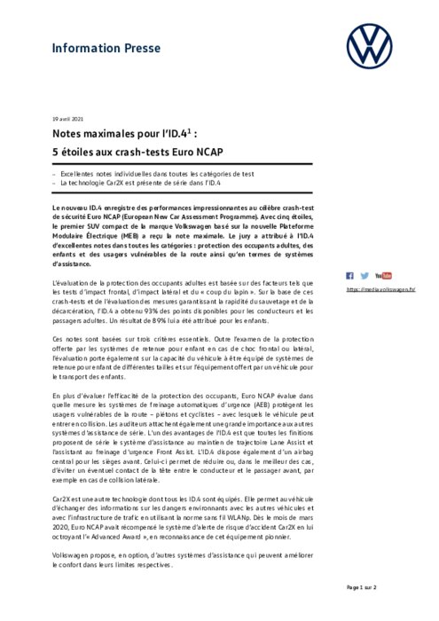 Le nouveau ID.4 enregistre des performances impressionnantes au célèbre crash-test de sécurité Euro NCAP (European New Car Assessment Programme). Avec cinq étoiles, le premier SUV compact de la marque Volkswagen basé sur la nouvelle Plateforme Modulaire Électrique (MEB) a reçu la note maximale. Le jury a attribué à l’ID.4 d’excellentes notes dans toutes les catégories : protection des occupants adultes, des enfants et des usagers vulnérables de la route...