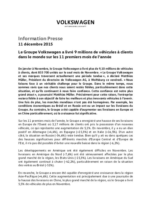 De janvier à Novembre, le Groupe Volkswagen a livré plus de 9,10 millions de véhicules à clients, dont 833 700 unités sur le seul mois de Novembre. " Le Groupe Volkswagen et ses marques traversent actuellement une période tendue ", a déclaré Matthias Müller, Président du directoire de Volkswagen, à Wolfsburg vendredi 11/12/15. " Nous faisons face à un véritable challenge pour le Groupe. Dans le même temps, nous sommes ravis que nos clients nous soient restés fidèles ".
