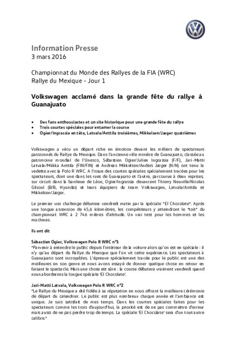 Volkswagen a vécu un départ riche en émotion devant les milliers de spectateurs passionnés du Rallye du Mexique. Dans l’ancienne ville minière de Guanajuato, classée au patrimoine mondial de l’Unesco, Sébastien Ogier/Julien Ingrassia (F/F), Jari-Matti Latvala/Miikka Anttila (FIN/FIN) et Andreas Mikkelsen/Anders Jæger (N/N) ont tenu la vedette avec la Polo R WRC.