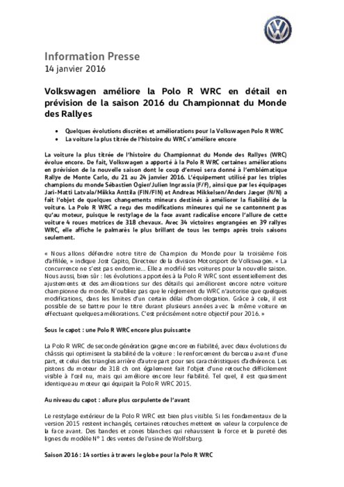 La voiture la plus titrée de l’histoire du Championnat du Monde des Rallyes (WRC) évolue encore. De fait, Volkswagen a apporté à la Polo R WRC certaines améliorations en prévision de la nouvelle saison dont le coup d’envoi sera donné à l’emblématique Rallye de Monte Carlo, du 21 au 24 janvier 2016.