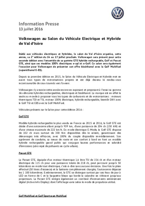 Dédié aux véhicules électriques et hybrides, le salon de Val d’Isère organise, cette année, sa 2e édition du 14 au 17 juillet prochain. Volkswagen sera présent pour cette seconde édition avec l’ensemble de sa gamme GTE hybride rechargeable, Golf et Passat GTE, ainsi que ses modèles 100% électriques e-up! et e-Golf. Ce salon sera également l’occasion pour Volkswagen de présenter son offre bioéthanol avec la Golf Multifuel (superéthanol E-85).