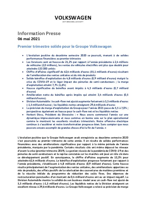 Le constructeur automobile Volkswagen a renoué au premier trimestre 2021 avec son rythme de croissance d'avant la pandémie, malgré la persistance de la crise sanitaire et "les effets légers" de la pénurie de puces électroniques, qui devraient être "plus significatifs" au deuxième trimestre.