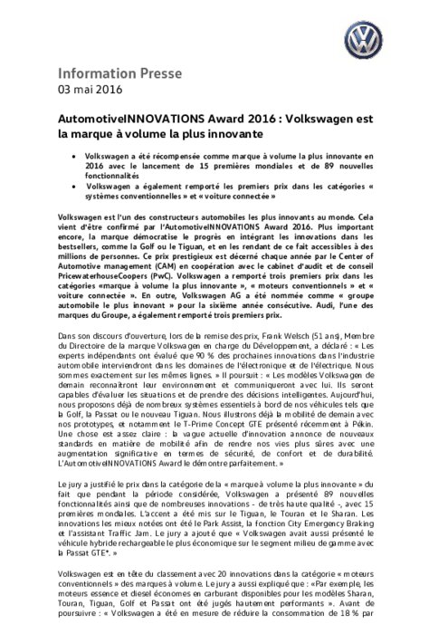 Volkswagen a été récompensée comme marque à volume la plus innovante en 2016 avec le lancement de 15 premières mondiales et de 89 nouvelles fonctionnalités. Volkswagen a également remporté les premiers prix dans les catégories «systèmes conventionnelles» et «voiture connectée».
