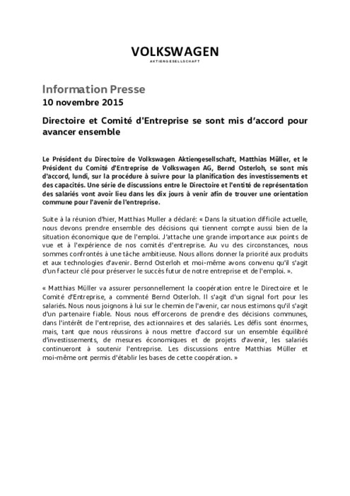 Le Président du Directoire de Volkswagen Aktiengesellschaft, Matthias Müller, et le Président du Comité d'Entreprise de Volkswagen AG, Bernd Osterloh, se sont mis d'accord, lundi, sur la procédure à suivre pour la planification des investissements et des capacités. Une série de discussions entre le Directoire et l'entité de représentation des salariés vont avoir lieu dans les dix jours à venir afin de trouver une orientation commune pour l'avenir de l'entreprise.