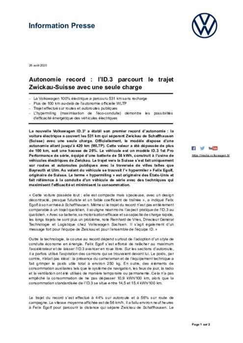 La nouvelle Volkswagen ID.3 a établi son premier record d’autonomie : la voiture électrique a couvert les 531 km qui séparent Zwickau de Schaffhausen (Suisse) avec une seule charge. Officiellement, le modèle dispose d’une autonomie allant jusqu’ à 420 km (WLTP). Cette valeur a été dé passée de plus de 100 km, soit une hausse de 26%. Le véhicule est un modèle ID.3 1st Pro Performance de série, équipé d’ une batterie de 58 kWh, construit à l ’usine de véhicules électriques de Zwickau...