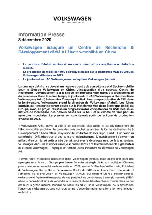 La province d’Anhui va devenir un nouveau centre de compétence et d’électro-mobilité pour le Groupe Volkswagen en Chine. L’inauguration d’un nouveau Centre de Recherche Développement sur le site de l’entreprise à Hefei marque la première étape du processus. Dans le même temps, la joint-venture JAC Volkswagen a été rebaptisée Volkswagen (Anhui) Automotive Company Limited. Avec une participation de 75% dans la joint-venture, Volkswagen prend la direction de Volkswagen (Anhui)...