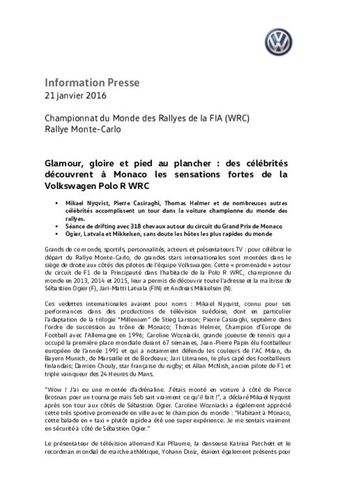 Grands de ce monde, sportifs, personnalités, acteurs et présentateurs TV : pour célébrer le départ du Rallye Monte-Carlo, des stars internationales sont montées dans le siège de droite aux côtés des pilotes de l’équipe Volkswagen. Cette promenade autour du circuit de F1 de la Principauté dans l’habitacle de la Polo R WRC, championne du monde en 2013, 2014 et 2015, leur a permis de découvrir toute l’adresse et la maîtrise de Sébastien Ogier (F), Jari-Matti Latvala (FIN) et Andreas Mikkelsen (N).