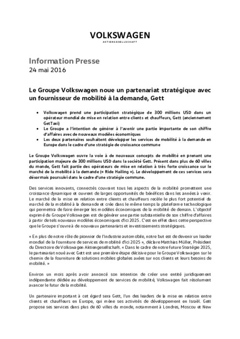 Le Groupe Volkswagen ouvre la voie à de nouveaux concepts de mobilité en prenant une participation majeure de 300 millions USD dans la société Gett. Présent dans plus de 60 villes du monde, Gett fait partie des opérateurs de mise en relation à très forte croissance sur le marché de la mobilité à la demande (« Ride Hailing »). Le développement de ces services sera désormais poursuivi dans le cadre d’une stratégie commune.