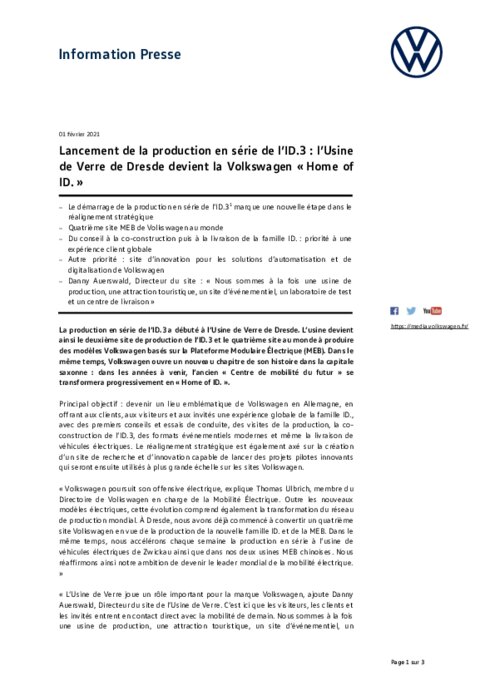 La production en série de l'ID.3 a débuté à l'Usine de Verre de Dresde. L'usine devient ainsi le deuxième site de production de l'ID.3 et le quatrième site au monde à produire des modèles Volkswagen basés sur la Plateforme Modulaire Électrique (MEB). Dans le même temps, Volkswagen ouvre un nouveau chapitre de son histoire dans la capitale saxonne : dans les années à venir, l'ancien « Centre de mobilité du futur » se transformera progressivement en « Home of ID. ».
