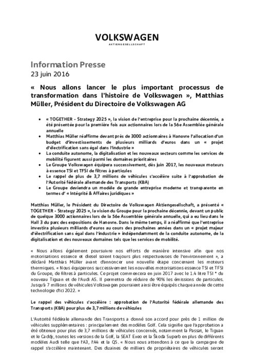 Matthias Müller, le Président du Directoire de Volkswagen, a présenté " TOGETHER - Strategy 2025 ", la vision du Groupe pour la prochaine décennie, devant un public de quelque 3000 actionnaires lors de la 56e Assemblée générale annuelle, qui a eu lieu dans le Hall 3 du parc des expositions de Hanovre. Dans le même temps, il a réaffirmé que l'entreprise investira plusieurs milliards d'euros au cours des prochaines années dans un " projet majeur d'électrification sans égal dans l'industrie ".