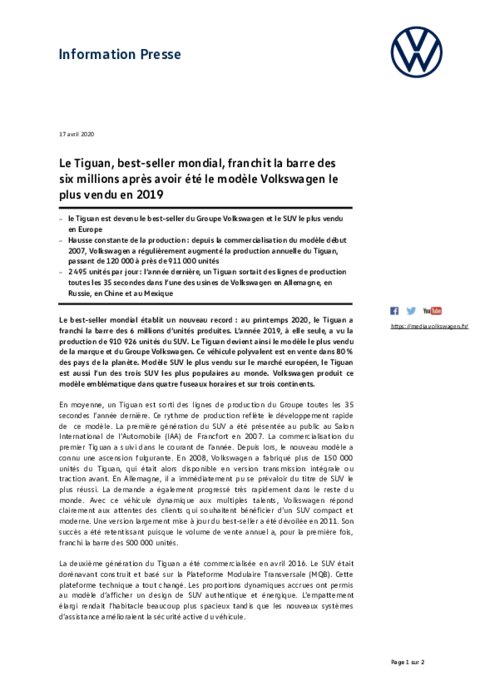 Le best-seller mondial établit un nouveau record : au printemps 2020, le Tiguan a franchi la barre des 6 millions d’unités produites. L’année 2019, à elle seule, a vu la production de 910 926 unités du SUV. Le Tiguan devient ainsi le modèle le plus vendu de la marque et du Groupe Volkswagen. Ce véhicule polyvalent est en vente dans 80 % des pays de la planète. Modèle SUV le plus vendu sur le marché européen, le Tiguan est aussi l’un des trois SUV les plus populaires au monde...