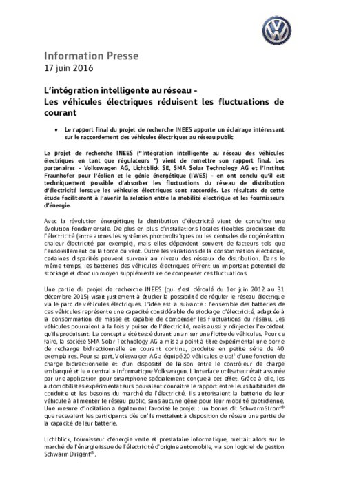 Le projet de recherche INEES "Intégration intelligente au réseau des véhicules électriques en tant que régulateurs" vient de remettre son rapport final. Les partenaires - Volkswagen, Lichtblick SE, SMA Solar Technology AG et l’Institut Fraunhofer pour l’éolien et le génie énergétique (IWES) - en ont conclu qu’il est techniquement possible d’absorber les fluctuations du réseau de distribution d’électricité lorsque les véhicules électriques sont raccordés.
