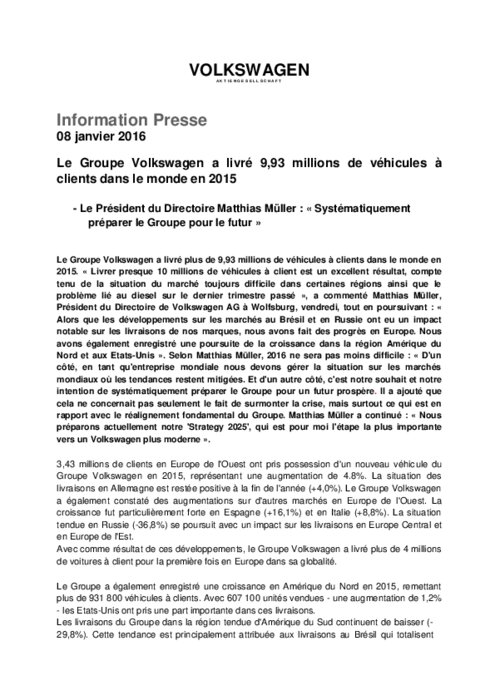 Le Groupe Volkswagen a livré plus de 9,93 millions de véhicules dans le monde en 2015. « Livrer presque 10 millions de véhicules à client est un excellent résultat, compte tenu de la situation du marché toujours difficile dans certaines régions ainsi que le problème lié au diesel sur le dernier trimestre passé », a commenté Matthias Müller, Président du Directoire de Volkswagen AG à Wolfsburg.