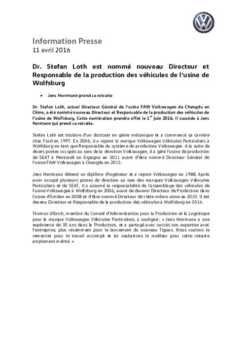 Dr. Stefan Loth, actuel Directeur Général de l’usine FAW Volkswagen de Chengdu en Chine, a été nommé nouveau Directeur et Responsable de la production des véhicules de l’usine de Wolfsburg. Cette nomination prendra effet le 1er juin 2016. Il succède à Jens Hermann qui prend sa retraite.