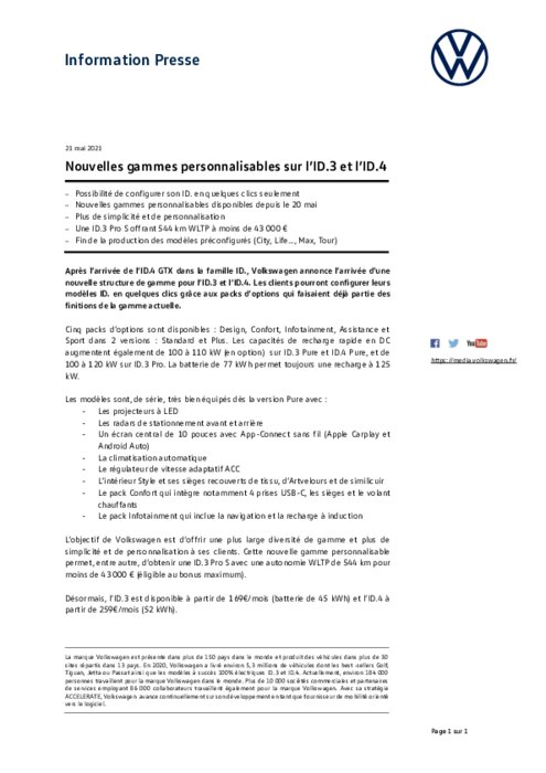 Après l’arrivée de l’ID.4 GTX dans la famille ID., Volkswagen annonce l’arrivée d’une nouvelle structure de gamme pour l’ID.3 et l’ID.4. Les clients pourront configurer leurs modèles ID. en quelques clics grâce aux packs d’options qui faisaient déjà partie des finitions de la gamme actuelle.