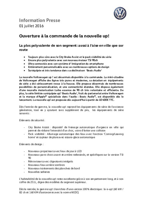 La nouvelle Volkswagen up ! est désormais disponible à la commande. La mini-citadine de Volkswagen affiche des lignes très pures et modernes, sa dotation en équipements de série a été sérieusement revue à la hausse. Elle propose désormais de nombreuses possibilités de personnalisation, et une connectivité étendue.