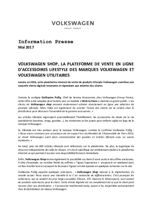 Constructeurs 10 mai 2017 - 16:09 Lancée en 2016, cette plateforme internet de vente de produits Lifestyle Volkswagen constitue une nouvelle vitrine digitale innovante et répondant aux attentes des clients. PDF (1 Mo) Télécharger