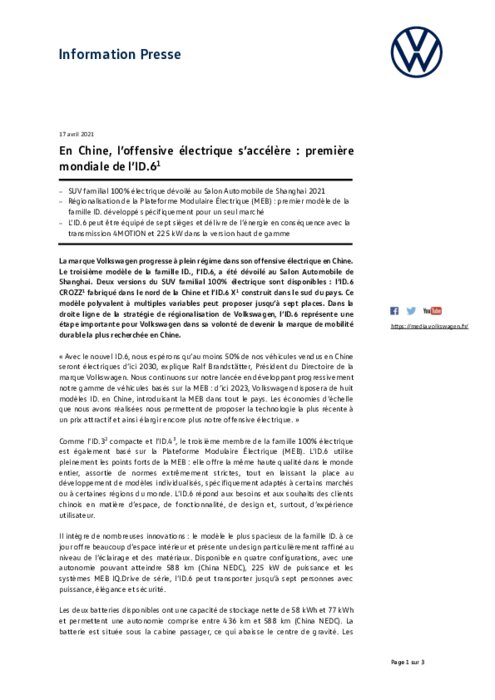 La marque Volkswagen progresse à plein régime dans son offensive électrique en Chine. Le troisième modèle de la famille ID., l’ID.6, a été dévoilé au Salon Automobile de Shanghai. Deux versions du SUV familial 100% électrique sont disponibles : l’ID.6 CROZZ1 fabriqué dans le nord de la Chine et l’ID.6 X1 construit dans le sud du pays. Ce modèle polyvalent à multiples variables peut proposer jusqu’à sept places...