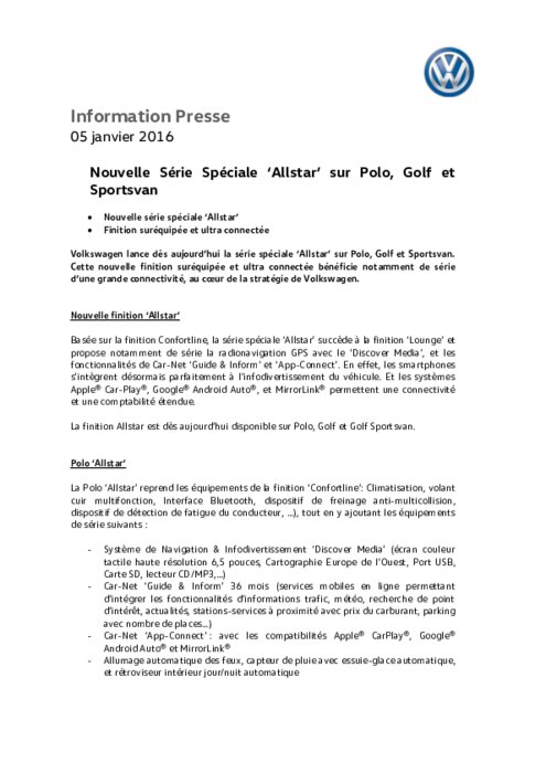 Constructeurs 05 janvier 2016 - 17:46 Volkswagen lance dès aujourd’hui la série spéciale ‘Allstar’ sur Polo, Golf et Sportsvan. Cette nouvelle finition suréquipée et ultra connectée bénéficie notamment de série d’une grande connectivité, au cœur de la stratégie de Volkswagen. PDF (131 Ko) Télécharger