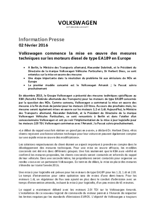 A Berlin, le Ministre des Transports allemand, Alexander Dobrindt, et le Président du Directoire de la marque Volkswagen Véhicules Particuliers, Dr Herbert Diess, se sont entendus sur la mise en œuvre des mesures.Une étape importante dans la résolution du problème lié aux émissions de NOx en Europe. Le premier modèle concerné est le Volkswagen Amarok ; la Passat suivra prochainement.