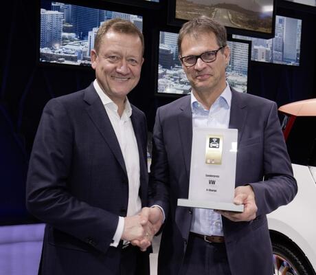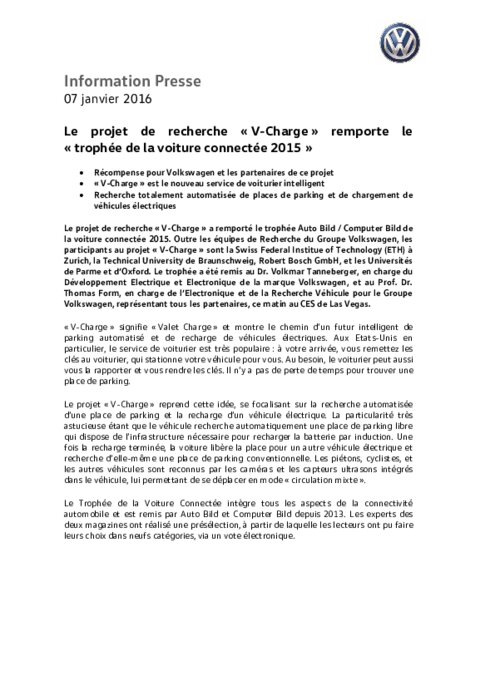 Le projet de recherche « V-Charge » a remporté le trophée Auto Bild / Computer Bild de la voiture connectée 2015. Outre les équipes de Recherche du Groupe Volkswagen, les participants au projet « V-Charge » sont la Swiss Federal Institue of Technology (ETH) à Zurich, la Technical University de Braunschweig, Robert Bosch GmbH, et les Universités de Parme et d’Oxford. Le trophée a été remis au Dr. Volkmar Tanneberger, en charge du Développement Electrique et Electronique de la marque Volkswagen.