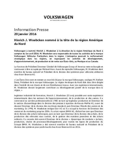 Volkswagen a nommé Hinrich J. Woebcken à la direction de la région Amérique du Nord à compter du 1er avril 2016. M. Woebcken sera responsable de toutes les activités de la marque Volkswagen Véhicules Particuliers dans la région. L’entreprise poursuit le renforcement stratégique dans les régions, en regroupant les activités de développement, d'approvisionnement, de production et de vente aux États-Unis, au Mexique et au Canada.