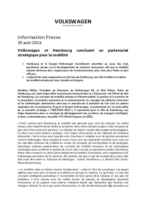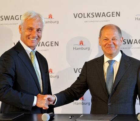 Matthias Müller, Président du Directoire de Volkswagen, et Olaf Scholz, Maire de Hambourg, ont signé le 30 août un protocole d’accord dans le " Kaisersaal " de l'hôtel de ville de Hambourg. Les concepts de mobilité urbaine et d'intermodalité, la gestion et le contrôle de la circulation, la conduite autonome et le stationnement, les concepts de véhicules innovants et les technologies alternatives ainsi que le contrôle de la pollution de l'air sont les pierres angulaires de ce partenariat.