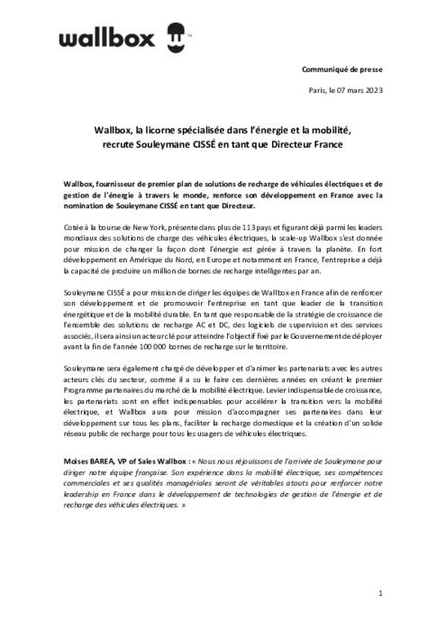 Services 07 mars 2023 - 11:57 Wallbox, fournisseur de premier plan de solutions de recharge de véhicules électriques et de gestion de l'énergie à travers le monde, renforce son développement en France avec la nomination de Souleymane CISSÉ en tant que Directeur. PDF (315 Ko) Télécharger