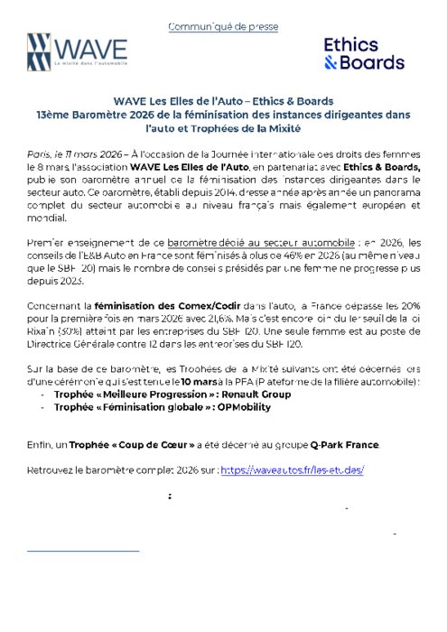 À l’occasion de la Journée internationale des droits des femmes le 8 mars, l’association WAVE Les Elles de l’Auto, en partenariat avec Ethics& Boards,publie son baromètre annuel de la féminisation des instances dirigeantes dans le secteur auto. Ce baromètre, établi depuis 2014, dresse année après année un panorama complet du secteur automobile au niveau français mais également européen et mondial.
