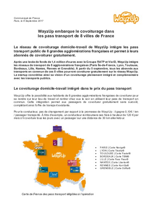 Après une levée de fonds de 1,4 million d’euros avec la RATP et Via ID, WayzUp intègre les réseaux de transport de 8 agglomérations françaises (Paris Île-de-France, Lyon, Toulouse, Bordeaux, Lille, Nantes, Rennes et Grenoble). À partir du 5 septembre 2017, tous les utilisateurs des transports en commun de ces 8 villes pourront covoiturer gratuitement sur le réseau WayzUp. La startup concrétise ainsi sa vision d’un covoiturage pleinement intégré et complémentaire avec les transports publics.