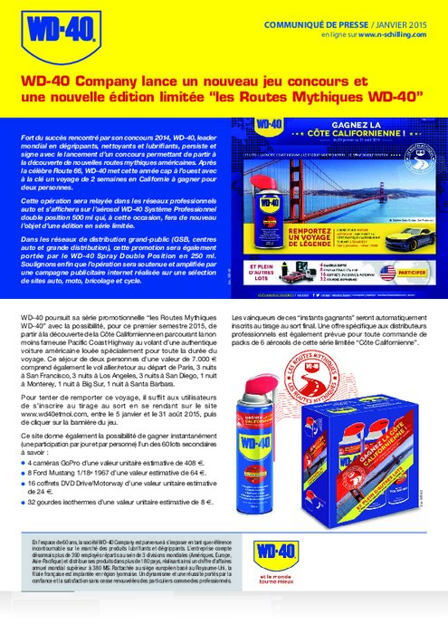 Fort du succès rencontré par son concours 2014, WD-40, leader mondial en dégrippants, nettoyants et lubrifiants, persiste et signe avec le lancement d’un concours permettant de partir à la découverte de nouvelles routes mythiques américaines. Après la célèbre Route 66, WD-40 met cette année cap à l’ouest avec à la clé un voyage de 2 semaines en Californie à gagner pour deux personnes.