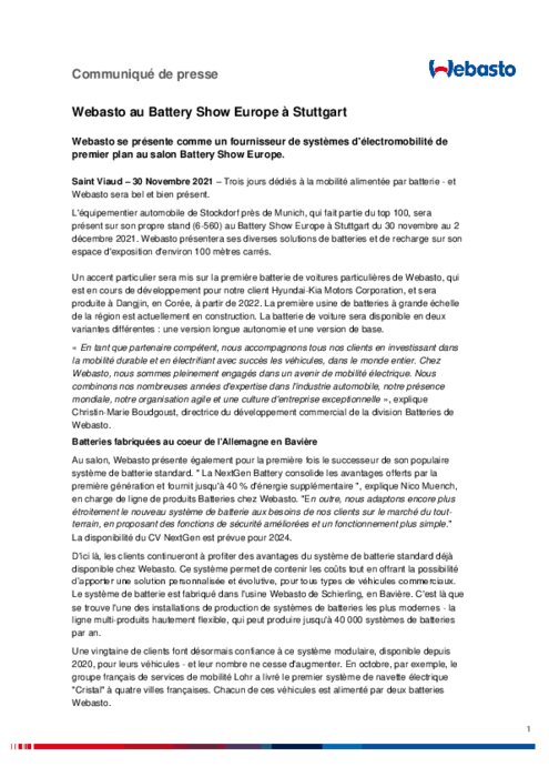 présent sur son propre stand (6-560) au Battery Show Europe à Stuttgart du 30 novembre au 2 décembre 2021. Webasto présentera ses diverses solutions de batteries et de recharge sur son espace d'exposition d'environ 100 mètres carrés.