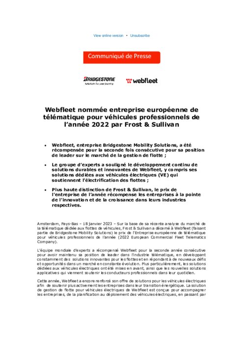 Sur la base de sa récente analyse du marché de la télématique dédiée aux flottes de véhicules, Frost & Sullivan a décerné à Webfleet (faisant partie de Bridgestone Mobility Solutions) le prix de l'Entreprise européenne de télématique pour véhicules professionnels de l’année (2022 European Commercial Fleet Telematics Company).