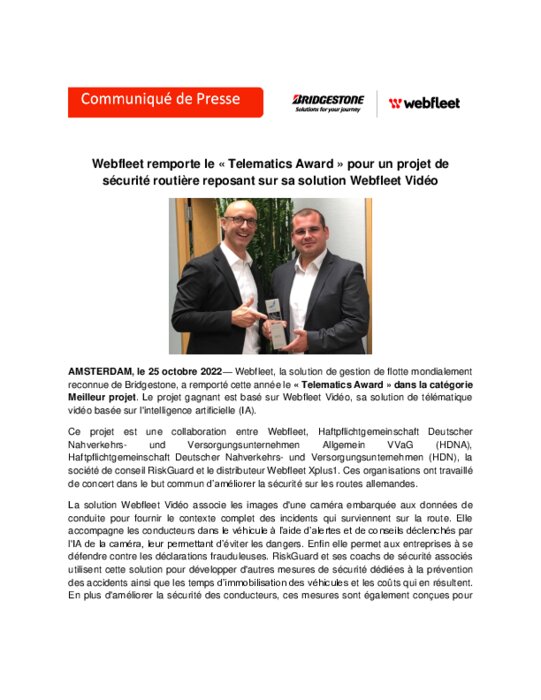 Webfleet, la solution de gestion de flotte mondialement reconnue de Bridgestone, a remporté cette année le « Telematics Award » dans la catégorie Meilleur projet. Le projet gagnant est basé sur Webfleet Vidéo, sa solution de télématique vidéo basée sur l'intelligence artificielle (IA).