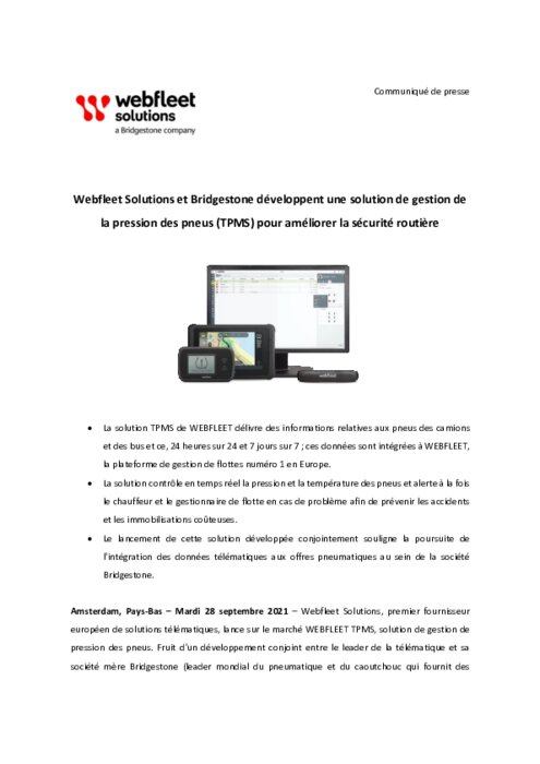 Webfleet Solutions, premier fournisseur européen de solutions télématiques, lance sur le marché WEBFLEET TPMS, solution de gestion de pression des pneus. Fruit d'un développement conjoint entre le leader de la télématique et sa société mère Bridgestone (leader mondial du pneumatique et du caoutchouc qui fournit des solutions pour une mobilité sûre et durable), cette solution permet une gestion prédictive des pneus intégrée à la solution de gestion de flotte primée WEBFLEET.