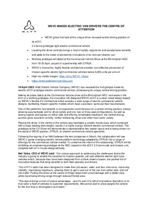 Watt Electric Vehicle Company (WEVC) a dévoilé le premier aperçu de son prototype de véhicule utilitaire électrique eCV1, mettant en valeur sa position de conduite centrale unique.