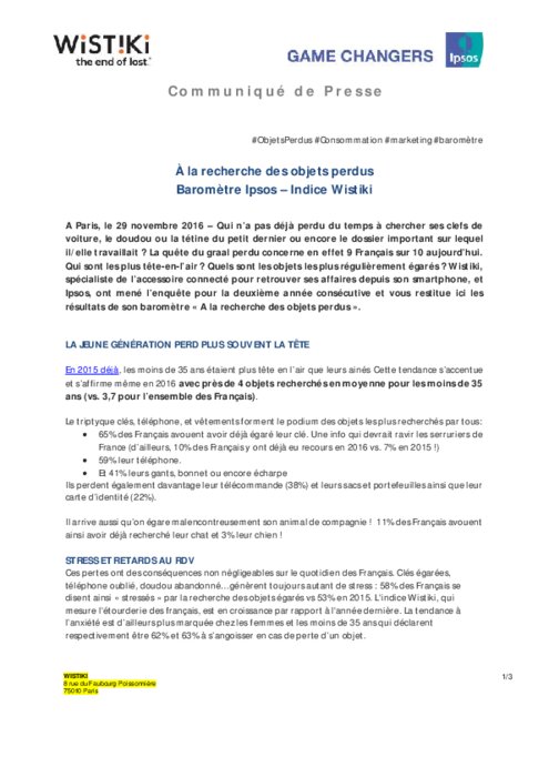 Qui n’a pas déjà perdu du temps à chercher ses clefs de voiture, le doudou ou la tétine du petit dernier ou encore le dossier important ? Qui sont les plus tête-en-l’air ? Quels sont les objets les plus régulièrement égarés ? Wistiki, spécialiste de l’accessoire connecté pour retrouver ses affaires depuis son smartphone, et Ipsos, ont mené l’enquête pour la deuxième année consécutive et vous restitue ici les résultats de son baromètre " A la recherche des objets perdus ".