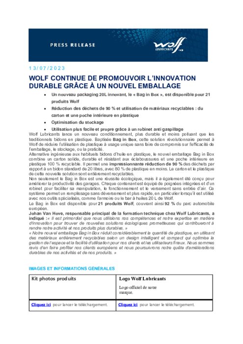 Wolf Lubricants lance un nouveau conditionnement, plus durable et moins polluant que les traditionnels bidons en plastique. Baptisée Bag in Box, cette solution révolutionnaire permet à Wolf de réduire l’utilisation de plastique à usage unique sans faire de compromis sur l’efficacité de l’emballage, le stockage, ou la praticité. Alternative ingénieuse aux habituels bidons d’huile en plastique, le nouvel emballage Bag in Box combine un carton solide, durable et résistant aux éclaboussures.