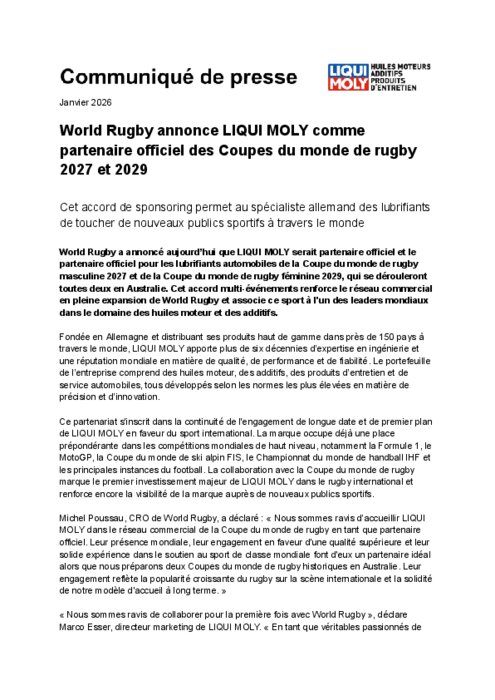 World Rugby a annoncé aujourd’hui que Liqui Moly serait partenaire officiel et le partenaire officiel pour les lubrifiants automobiles de la Coupe du monde de rugby masculine 2027 et de la Coupe du monde de rugby féminine 2029, qui se dérouleront toutes deux en Australie. Cet accord multi-événements renforce le réseau commercial en pleine expansion de World Rugby et associe ce sport à l'un des leaders mondiaux dans le domaine des huiles moteur et des additifs.