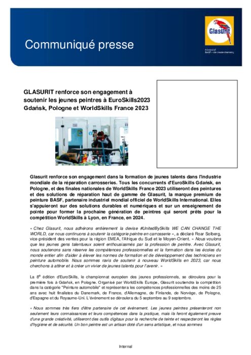 Tous les concurrents d'EuroSkills Gdańsk, en Pologne, et des finales nationales de WorldSkills France 2023 utiliseront des peintures et des solutions de réparation haut de gamme de Glasurit, la marque premium de peinture BASF, partenaire industriel mondial officiel de WorldSkills International.