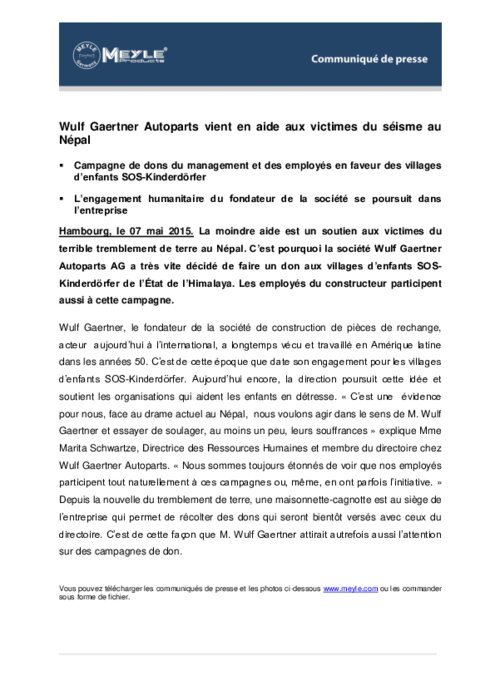 Wulf Gaertner Autoparts aide les victimes du séisme au Népal