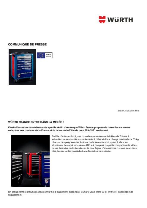 C'est à l'occasion des évènements sportifs de fin d'année que Würth France propose de nouvelles servantes collectors aux couleurs de la France et de la Nouvelle-Zélande pour 329 € HT seulement. En tôle d'acier renforcé, ces nouvelles servantes sont dotées de 7 tiroirs à extraction totale montés sur roulements à billes et d'une charge maximale de 35 kg chacun. Les poignées des tiroirs et de la servante sont, quant à elles, en aluminium.