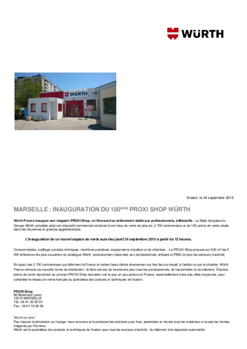 Würth France inaugure son magasin PROXI Shop, un libre-service entièrement dédié aux professionnels, à Marseille. La filiale française du Groupe Würth complète ainsi son dispositif commercial constitué d'une force de vente de plus de 2 700 commerciaux et de 100 points de vente situés dans les moyennes et grandes agglomérations. L'inauguration de ce nouvel espace de vente aura lieu jeudi 24 septembre 2015 à partir de 12 heures.