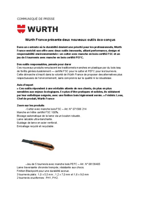 Dans un contexte où la durabilité devient une priorité pour les professionnels, Würth France enrichit son offre avec deux outils innovants, alliant performance, design et responsabilité environnementale :un cutter avec manche en bois certifié FSCet un jeu de 5 tournevis avec manche en bois certifié PEFC.